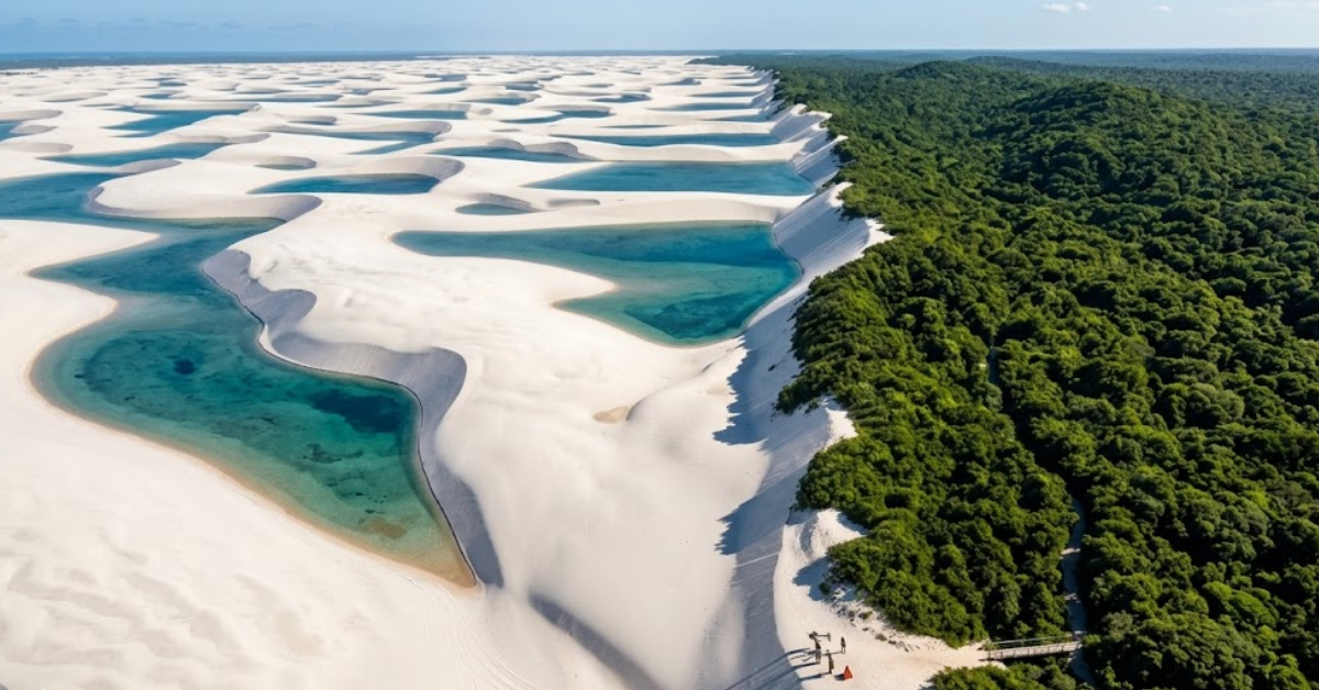 A afirmação chamou atenção não apenas pelo impacto visual que provoca, mas pela singularidade do cenário brasileiro. Localizado no Maranhão, o parque nacional abriga uma combinação incomum de elementos naturais. À primeira vista, o visitante se depara com extensas dunas de areia branca, moldadas pelos ventos ao longo dos anos. No entanto, o que torna o local verdadeiramente único são as lagoas de água cristalina que surgem entre essas formações, especialmente durante o período chuvoso.