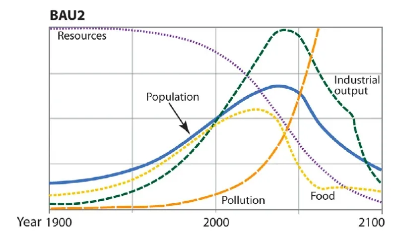 O modelo indicava que o crescimento populacional e industrial levaria, em algum ponto, à sobrecarga dos sistemas de suporte à vida na Terra. À medida que os recursos naturais fossem esgotados e os níveis de poluição aumentassem, a capacidade de produção de alimentos e bens cairia, resultando em escassez, fome, colapso de economias e, por consequência, instabilidade social generalizada. O cenário descrito era chamado de “overshoot and collapse”, ou seja, um período de crescimento além dos limites sustentáveis seguido por uma queda abrupta e descontrolada.