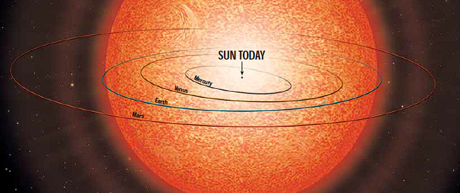 Quando esse combustível terminar, a estrela entrará em colapso parcial e, em seguida, passará a queimar hélio, o que fará seu volume aumentar de maneira colossal. O Sol se expandirá até se transformar em uma gigante vermelha, atingindo proporções tão imensas que sua atmosfera abrasadora alcançará órbitas hoje ocupadas por planetas próximos. Mercúrio e Vênus serão completamente engolidos e, segundo a maioria dos modelos, a Terra também acabará consumida, deixando de existir como planeta habitável muito antes disso. Mesmo que por algum acaso escape da absorção final, as mudanças no Sol tornarão impossível qualquer forma de vida, já que os oceanos terão evaporado e a superfície estará carbonizada.