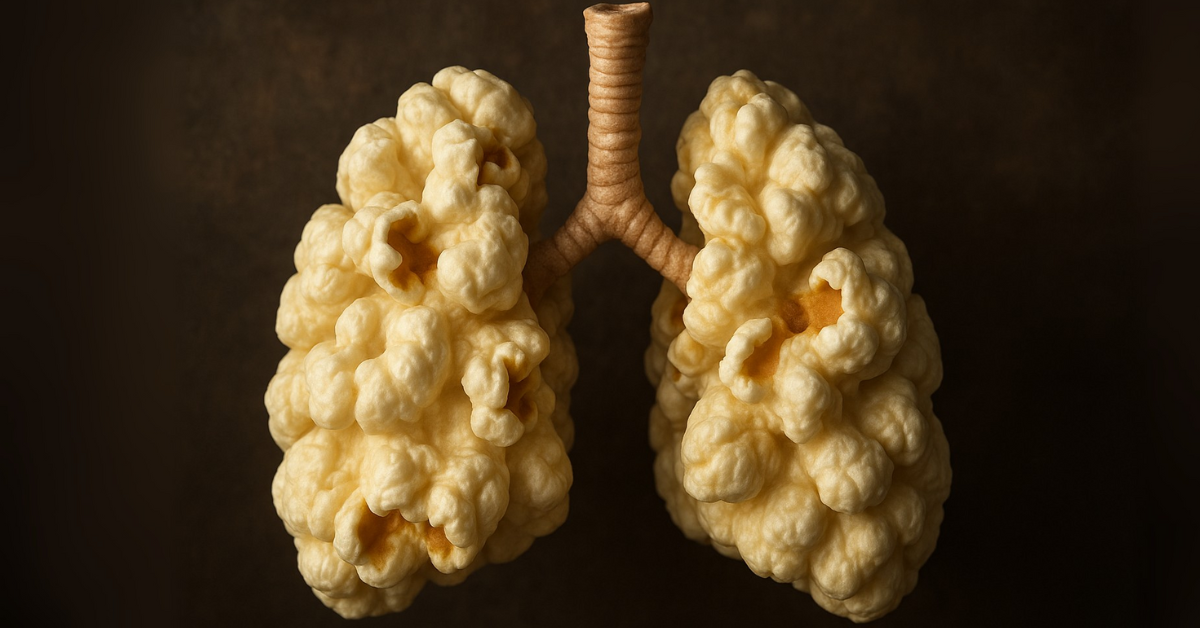 Nos últimos anos, um número crescente de jovens brasileiros tem apresentado sintomas de uma condição pulmonar grave, muitas vezes irreversível, conhecida como “pulmão de pipoca”. Apesar do nome curioso, a doença é tudo menos inofensiva. Trata-se da bronquiolite obliterante, um distúrbio inflamatório raro que provoca a obstrução dos bronquíolos as pequenas vias aéreas do pulmão devido à cicatrização progressiva dos tecidos. Essa condição ganhou o apelido “pulmão de pipoca” após uma série de casos ocorridos nos Estados Unidos com trabalhadores de fábricas de pipoca de micro-ondas, que inalaram por longos períodos um composto químico chamado diacetil, utilizado para dar sabor artificial de manteiga.