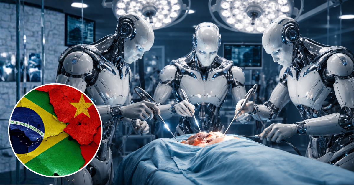 Continue lendo...Sala cirúrgica futurista mostra robôs humanoides realizando cirurgia com inteligência artificial, alta precisão e integração total com tecnologia médica avançada.