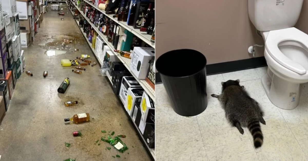 Guaxinim invade loja na Virgínia, cai do teto, derruba uísque, acaba desmaiado no banheiro e é resgatado sem ferimentos antes de voltar à natureza.