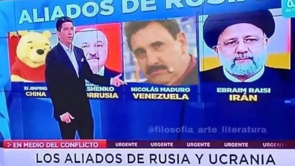 Na versão adulterada que circula nas redes, a foto de Nicolás Maduro foi trocada pela imagem de Ratinho. Além disso, o presidente da China, Xi Jinping, aparece representado como o personagem Ursinho Pooh, recurso recorrente em memes e montagens críticas nas redes sociais.